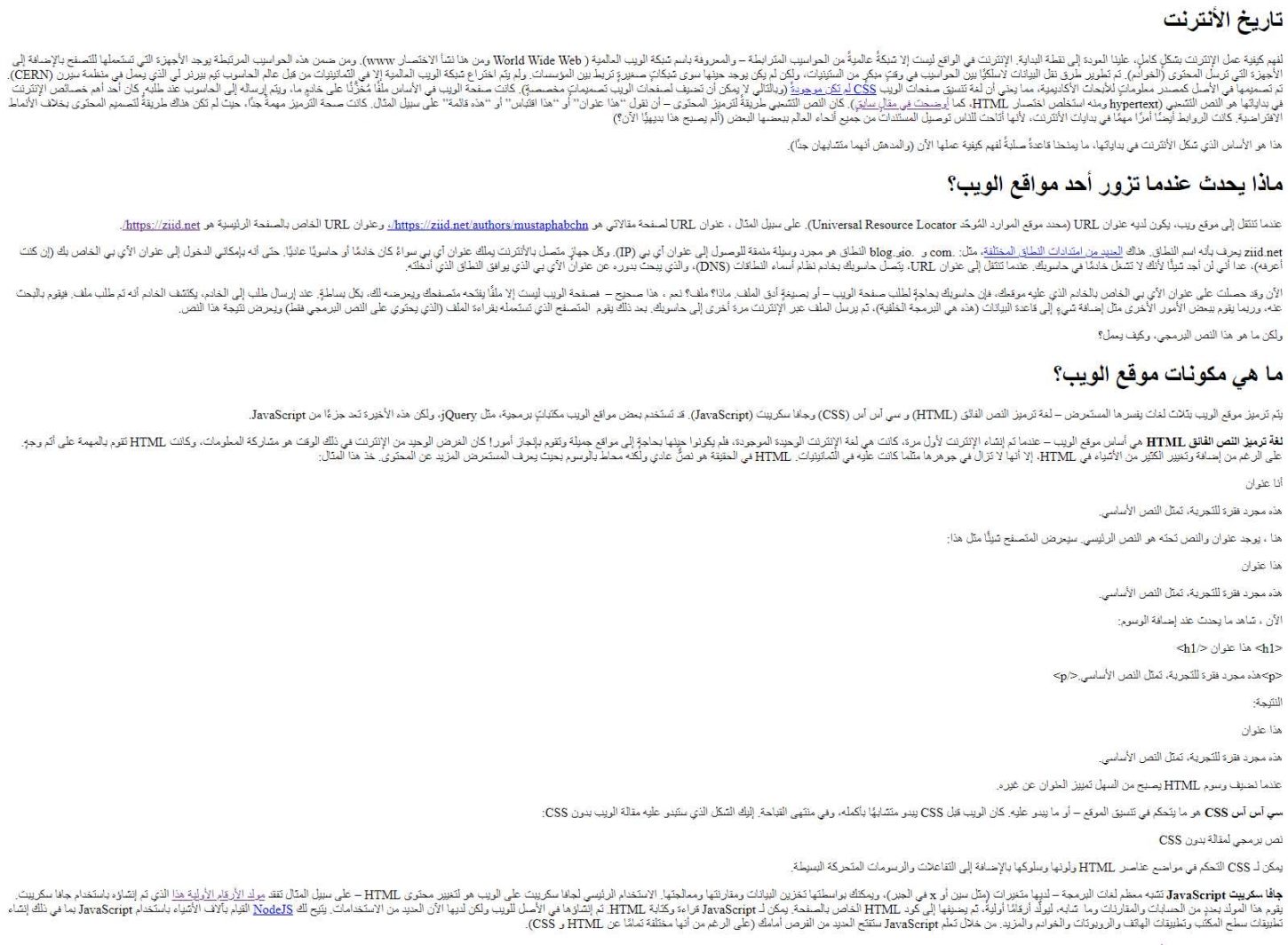 هذه مجرد فقرة للتجربة، تمثل النص الأساسي. عندما نضيف وسوم (HTML) يصبح من السهل تمييز العنوان عن غيره. من جهتها، سي إس إس (CSS) هي ما يتحكم في تنسيق الموقع – أو ما يبدو عليه. كان الويب قبل (CSS) يبدو متشابهًا بأكمله، وفي منتهى القبح. إليك الشكل الذي ستبدو عليه مقالة الويب بدون CSS: